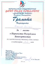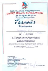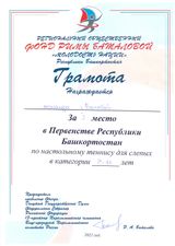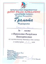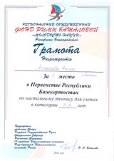 Вместе с учащимися ГБОУ Белебеевская КШ для слабовидящих обучающихся успешно выступил и выпускник учреждения, а теперь учащийся 5 класса МАОУ «Татарская гимназия с отделением искусств г.Белебея» Цой Урал, который занял 2 место в возрастной категории 12-14 лет. Ребята сумели выйти на призовые места благодаря усиленным занятиям под руководством профессионального тренера, мастера спорта по теннису Эгодыш Альбины Габдулловны.