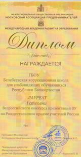 В рамках Рождественского Приема проводился конкурс презентаций образовательных учреждений.ГБОУ Белебеевская коррекционная школа для слабовидящих обучающихся стала Лауреатом I степени всероссийского конкурса презентаций ОУ.